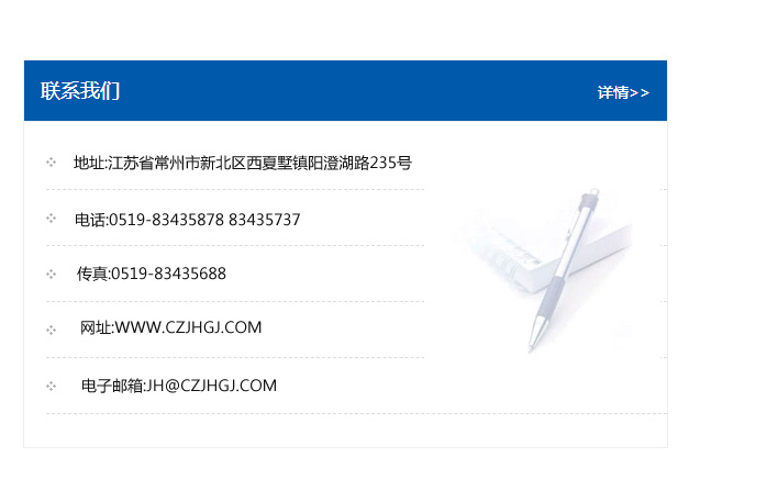 地址:常州市新北區友邦商務大廈1幢16、17層  電話:0519-85101652  傳真:0519-85112595  郵編:213022  網址:www_cz-jiayue_cn.bjyanhongzhixiang.com  郵箱:xiajifengaa@163.com